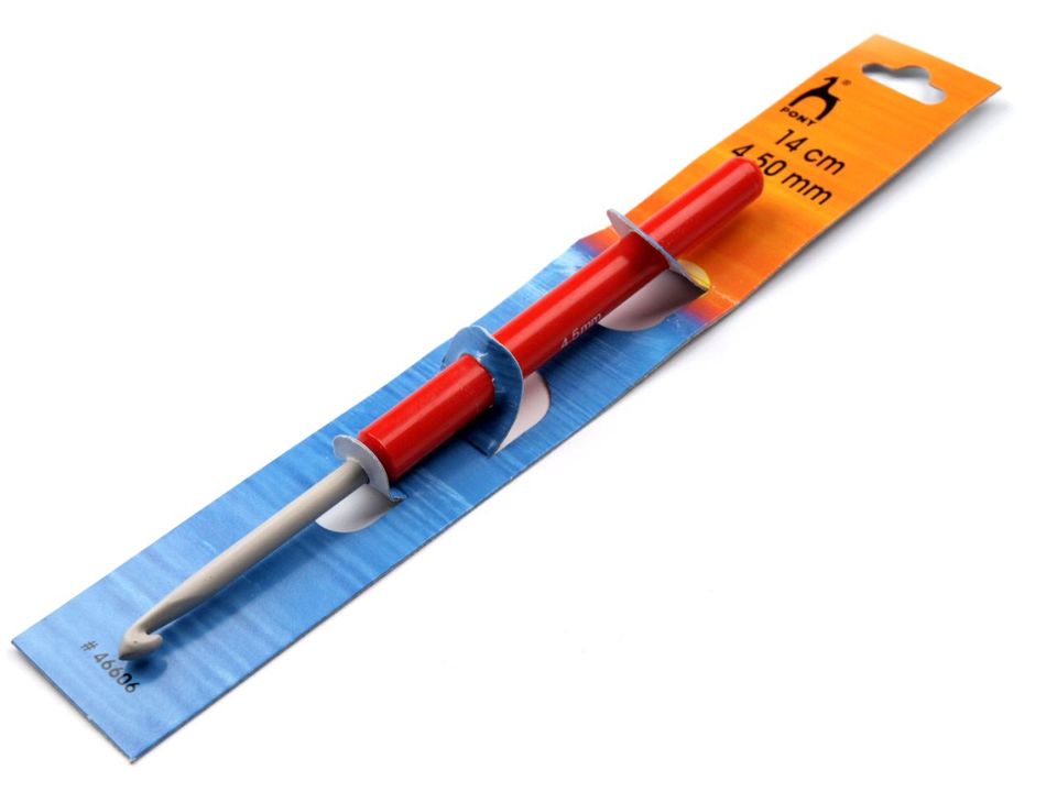 Háček na háčkování. Rukojeť je vyrobena z plastu pro pohodlnější uchopení, háček vyrobez ze slitiny hliníku
