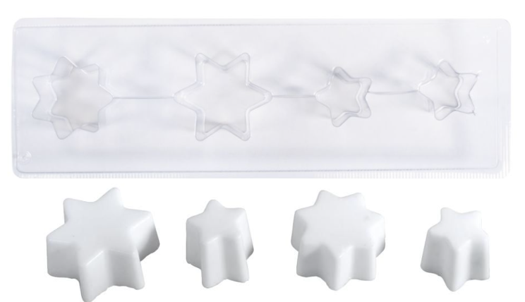 Forma na hvězdy se skládá ze 4 tvarů hvězd různých velikostí: 5,5x5,5cm, 4,5x4,5cm, 2x 3x3cm. Hloubka formiček: 3 cm