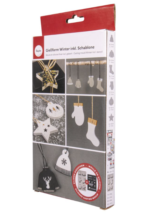 Forma se skládá ze 6 tvarů: hvězda 64x64 mm, ponožka 50x72 mm, rukavice 35x67 mm, svetr 65x55 mm, čepice 42x55 mm, vánoční koule 54x65 mm. Všechny tvary mají otvor na zavěšení.