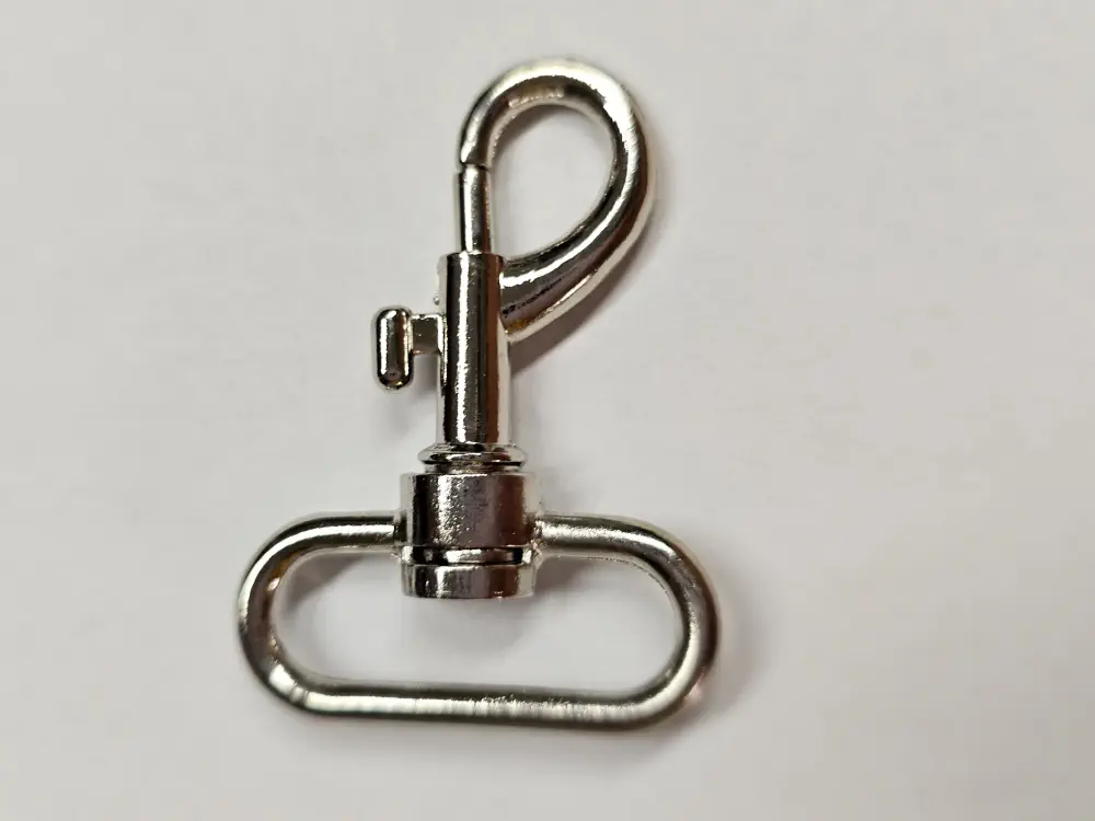 Kovová karabina je otočná. Díky své velikosti je vhodná na upevnění popruhů k taškám či kabelkám a také na výrobu vodítek pro psy.