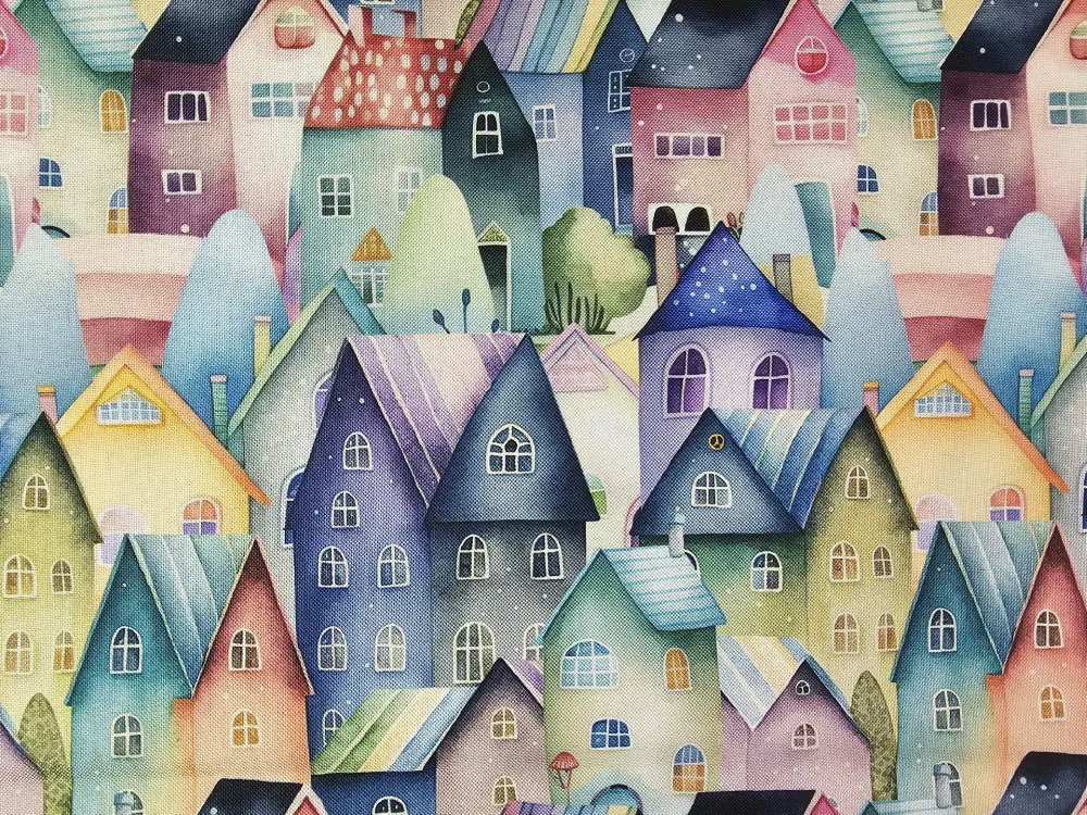 Tato krásná kočárkovina - batohovina se vzorem barevných domečků ve fialovém odstínu je vhodná na šití tašek,kabelk, batohů, pelíšků pro domácí mazlíčky,pouzder na kosmetiku nebo psací potřeby.