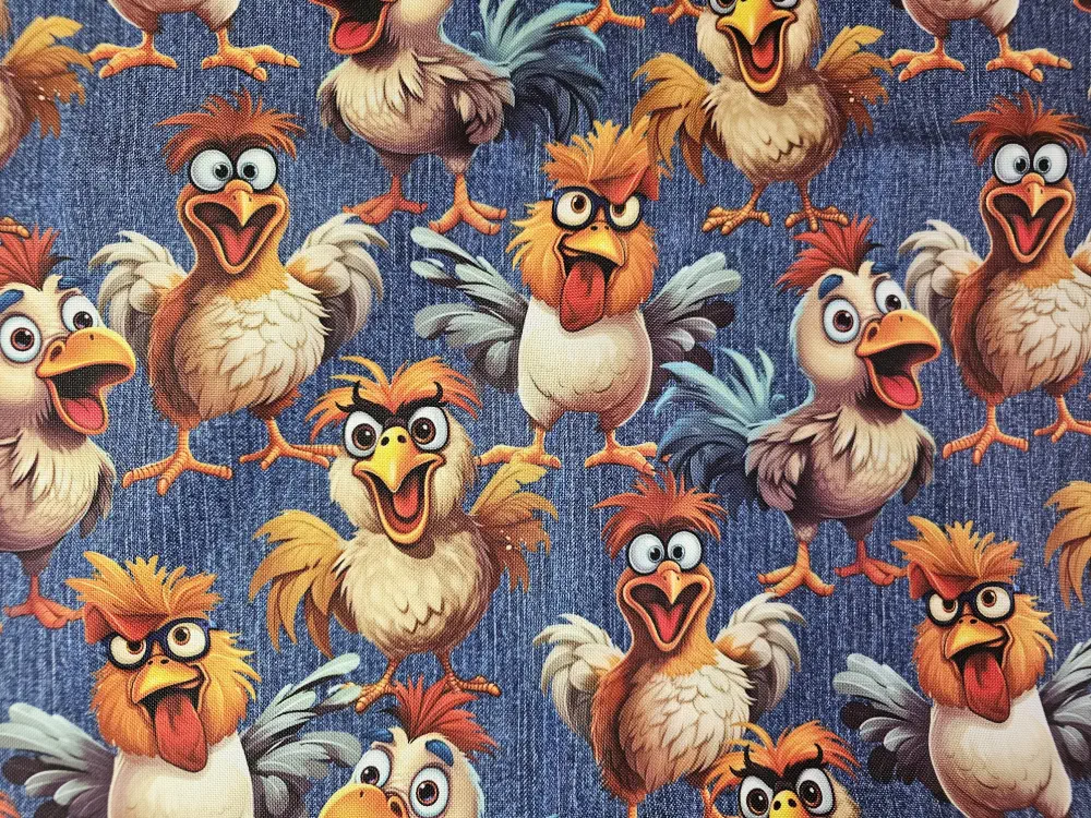 Tato krásná kočárkovina - batohovina s veselým motivem blaznivyých slepic na podkladu modrý denim je vhodná na šití tašek, batohů, pelíšků pro domácí mazlíčky,pouzder na kosmetiku nebo psací potřeby.