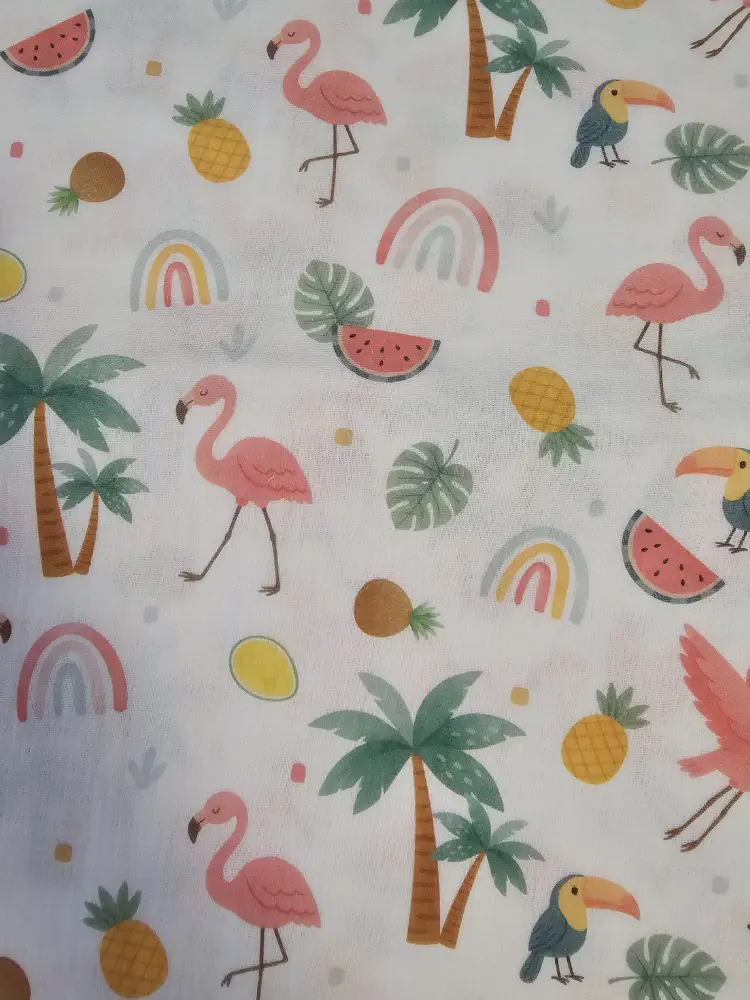 Hravý tropický motiv s plameňáky, palmami, tukany, ananasy, melouny a duhovými oblouky v jemných pastelových barvách na světlém podkladu.