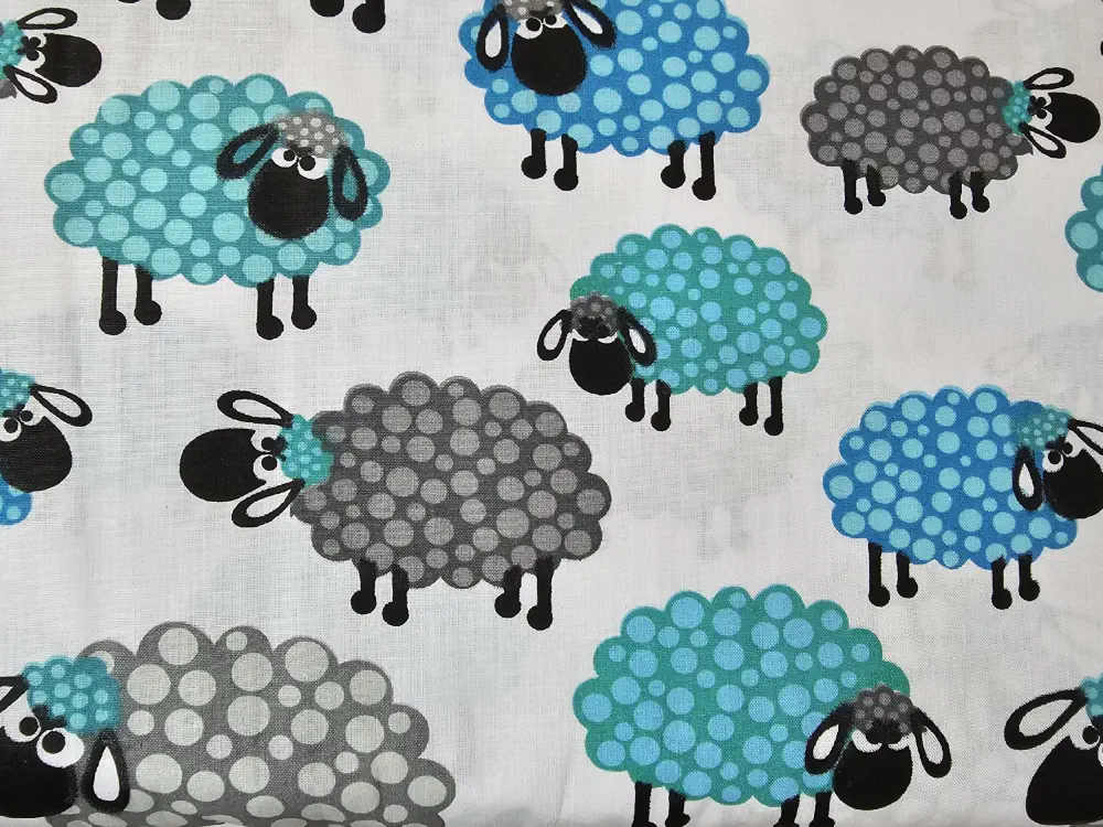 Bavlněnou látku s veselými motivy oveček využijete na šití polštářů, povlečení, závěsů, pytlíků, tašek, mantinelů do postýlek i hnízd pro děti.