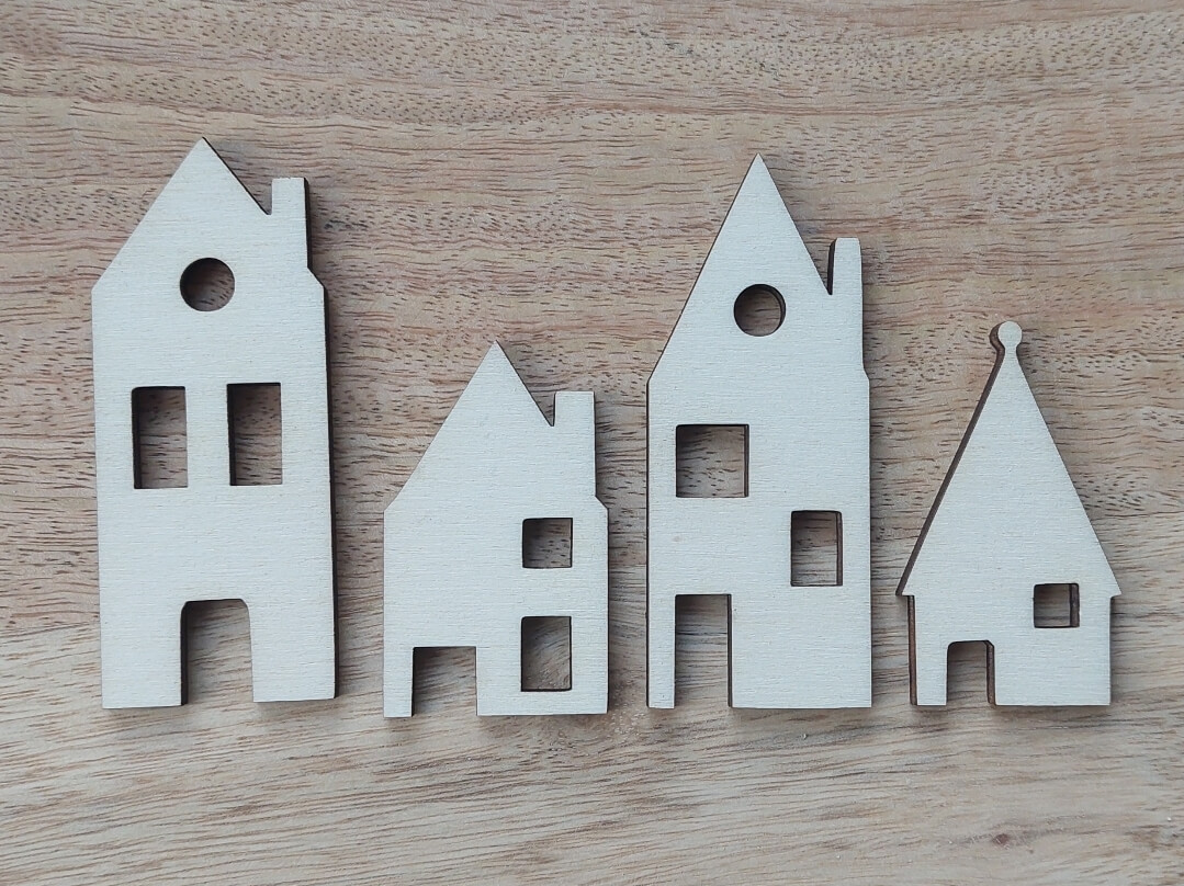 Domečky jsou vyrobeny ze 4mm překližky. Výška 5 - 8 cm.