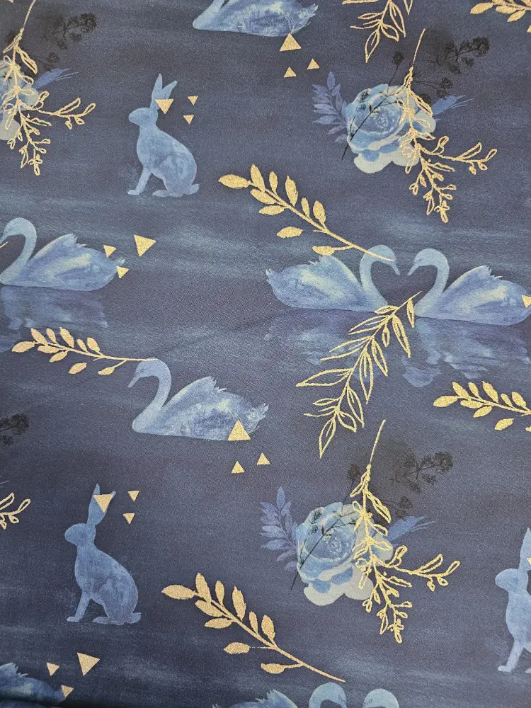 Jemný, snový vzor na tmavě modrém podkladu s labutěmi, zajíčky a květinovými motivy doplněnými zlatými větvičkami a drobnými geometrickými prvky.