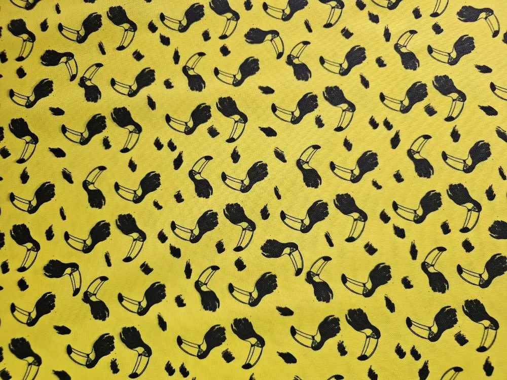 Autorský vzor s výraznými tukany na kontrastním podkladu. Grafický motiv působí hravě a moderně, vzor je dobře čitelný a výrazný i na větších plochách. Digitální tisk zajišťuje syté barvy a ostré linie.