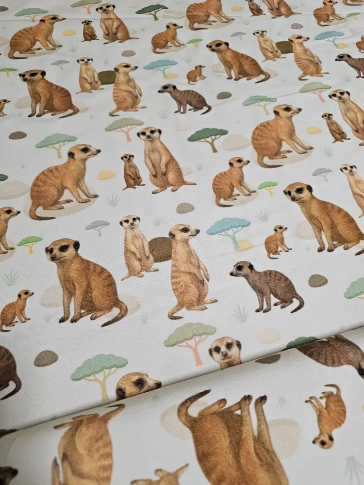 Veselý bavlněný úplet s autorským vzorem oblíbených zvědavých surikat. Ideální na trička, pyžama, šaty nebo sukýnky. Pružný, příjemný na tělo a lehký, přitom není průhledný.