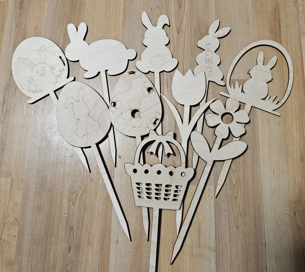 Tyto velikonoční zápichy z březové překližky jsou ideální pro společné tvoření – stačí barvy, fixy nebo pastelky a během chvilky vznikne originální dekorace do květináče, truhlíku nebo velikonoční výzdoby.